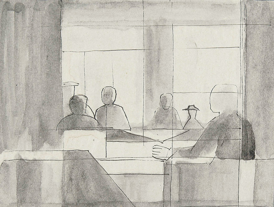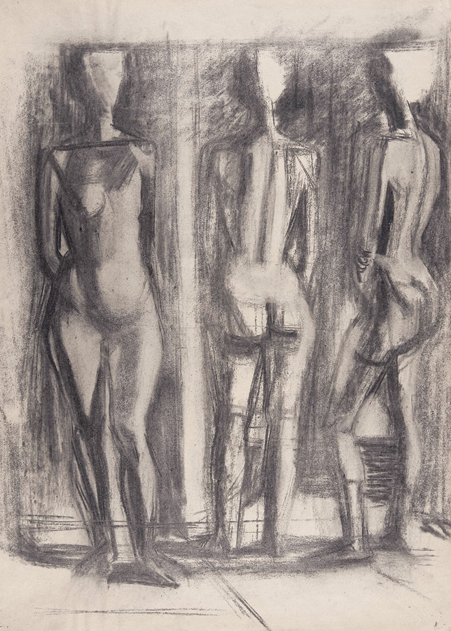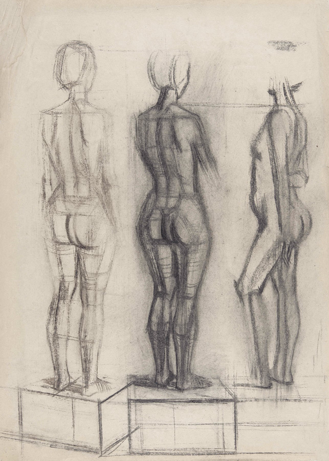 Najviše sati bilo je ipak posvećeno crtanju akta koji je kao vježba slijedio nakon pripremnih vježbi. Ljudsko tijelo smo sada već shvaćali kao da se radi o štafelajima ili krovovima kuća – u gusto složenim i nekako stanjenim planovima – pa se smisao vježbe svodio na prijelaz iz dvodimenzionalnih, plošnih kompozicija, na prikaz volumena u prostoru. To smo činili tako da bi najprije identificirali bliže i udaljenije planove od kojih se model sastojao, a zatim bi ih spajali putem presjeka. Čini mi se suvišno napominjati da smo se i u tom zadatku također služili prethodno ucrtanim tlocrtom. Ipak, model se ucrtavao istodobno u nekoliko pozicija u isti format, pa su tako nastajale kompozicije koje smo popularno nazivali »tri gracije«. Sva ta studijska rješenja oblikovala su se također i kao slobodne izvedbe u različitim tehnikama, odnosno materijalima, pa bi se naše »tri gracije« prošetale od crtačkih vježbi, preko grafičkih realizacija, sve do slikanja na dasci s jajčanim emulzijama. Naposljetku, jedna od važnih vježbi bila je i iscrtavanje slova, rimske kapitale, na zidu. Pritom smo uvježbavali osjećaj za proporcije, te za odnos takozvanih pozitivnih spram negativnih prostora. Uz to, budući da smo slova oblikovali u raznim veličinama, pa čak i u više slojeva, te uz pomoć različitih boja, nastajale su kompozicije gotovo poentilističkih efekata.